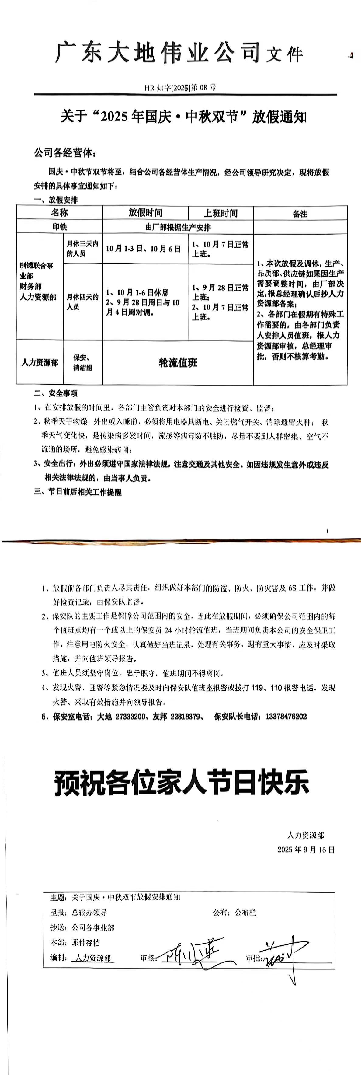 广东大地伟业公司2025年国庆及中秋双节放假通知